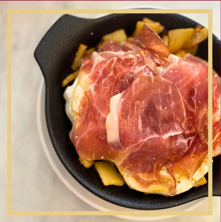 Huevos fritos sobre cama de patatas fritas, pimentón de la Vera y jamón ibérico.